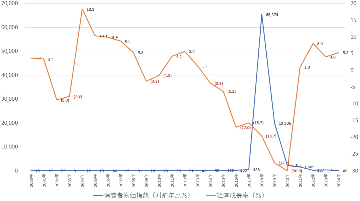 ベネズエラのインフレ率(左軸、%)と経済成長率(右軸、%)