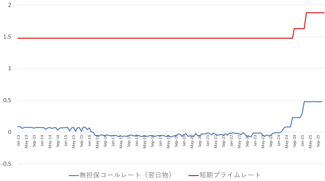 無担保コールレート(翌日物)と短期プライムレート(%)