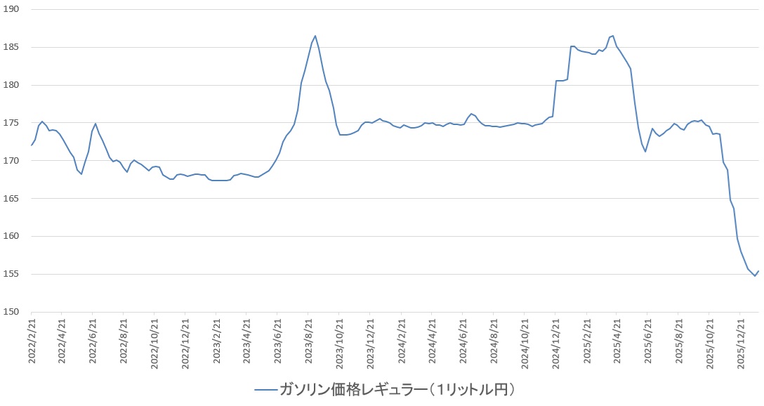日本のガソリン価格(レギュラー)の推移(1リットル円)