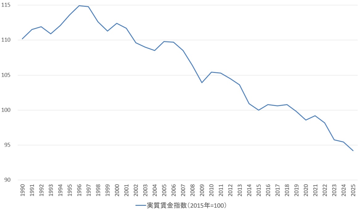 日本の実質賃金指数の推移(2015年=100)
